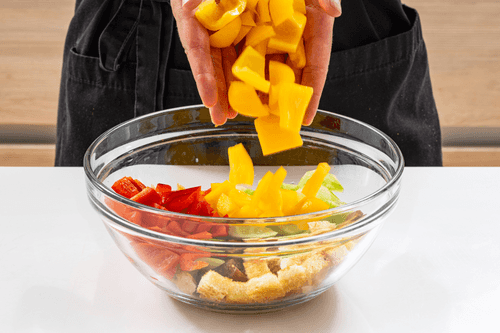 Add garlic, pepper, and cucumber to the bowl with the bread.