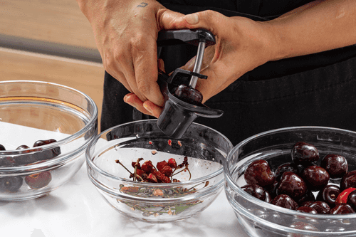 Remove the pits from the cherries, add the berries to a bowl (save 12 berries to chop for serving).