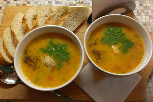 Add toasted flour with garlic to the broth. Bring the soup to a boil.