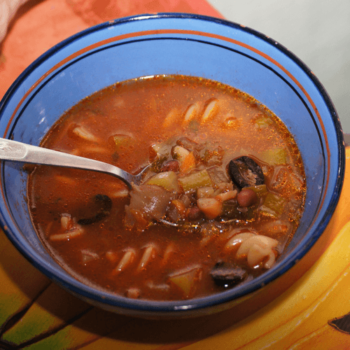 Tomato soup with red beans and oyster mushrooms is a vibrant dish of Georgian cuisine, rich in flavors and aromas. Its roots trace back to the traditions of Caucasian gastronomy, where the combination of legumes, mushrooms, and spices creates a unique depth of flavor. Red beans add heartiness to the soup, oyster mushrooms provide a delicate texture, and tomato paste adds a pleasant tanginess. Khmeli-suneli and cardamom enrich the aroma while olives add a spicy note. This soup is an ideal choice for a cozy lunch or dinner; it warms you up and fills you with energy. Served hot and garnished with olives, it pairs wonderfully with fresh bread or flatbreads. Such a dish is not only tasty but also healthy due to its richness in vitamins and minerals.