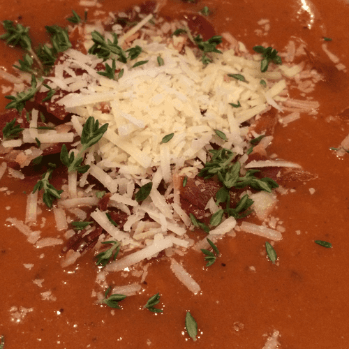 Serve slightly cooled and salted to taste, topped with grated parmesan and fresh thyme leaves, and optionally broken bacon chips.