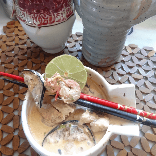 Tom Yum with eggplants, chicken, and seafood is an Eastern gastronomic wonder that combines the heat of passionate spices and the tenderness of marine gifts. Traditionally originating from Thailand, its adaptation with eggplants and chicken makes it unique while maintaining a balance of spiciness, sourness, and creamy texture thanks to coconut cream. The velvety broth infused with lime, ginger, and coriander aromas fills each sip with layered flavor, while the variation with roasted eggplants adds a pleasant textural depth to the dish. This soup is perfect for warming dinners, offering vibrant taste and a sense of coziness. It pairs especially well with rice that gently tones down the spiciness and fresh cilantro that highlights the dish's exotic character.