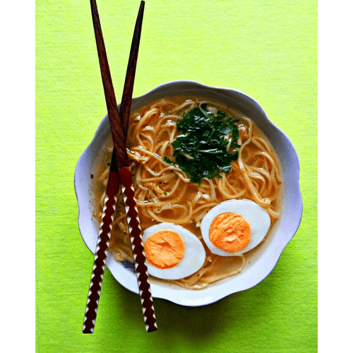 Pork ramen is a classic Japanese dish that combines rich broths, tender noodles, and aromatic chashu pork. Its history traces back to Chinese cuisine but over time ramen has become one of Japan's symbols. This version blends three types of broth to create a deep flavor enhanced by sesame oil. The noodles are cooked for just two minutes, remaining firm and perfectly complementing the spicy meat, marinated eggs, and crunchy greens. Sesame seeds add nutty notes while nori leaves provide a light sea accent. Ramen is served hot to highlight its warming and rich taste and is best enjoyed immediately after preparation while the noodles retain their texture. This dish is not only nutritious but also a true delight for gourmets, embodying the traditions and craftsmanship of Japanese cuisine.