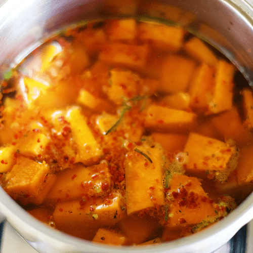 Brush all pieces of pumpkin with the mixture after making several cuts on each.