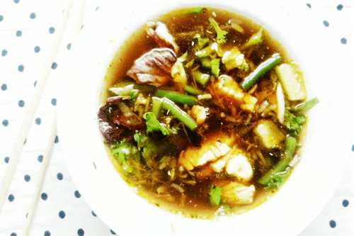 Add lightly salted pieces (not small) of fish to the broth, shrimp can be added, reduce the heat, and simmer for 10-15 minutes to allow the salt from the fish to leach into the broth.