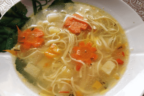 We return to the broth: we take out its contents, strain it and put it back on the heat. Add diced potatoes and bring to a boil. Then add soup seasoning, and after 10-15 minutes add the prepared homemade noodles to the boiling broth. Salt and pepper to taste.