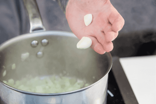 In a large saucepan, melt the butter, add crushed garlic and chopped onion and leek, stir and sauté for three minutes.
