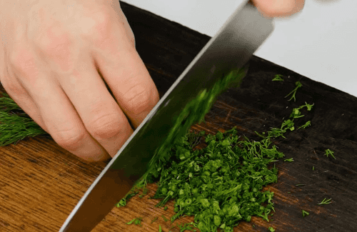 Chop dill and parsley, finely chop garlic, slice leek and onion into rings. Peel potatoes and cut into 2.5 cm cubes.