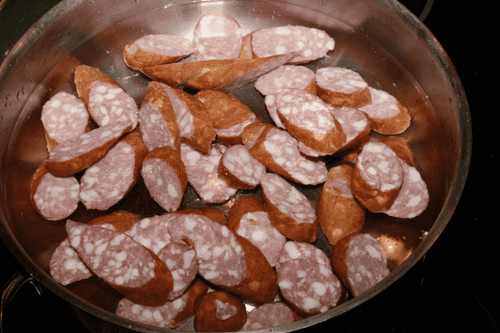 Pour 1.5 liters of water over the smoked sausage in a large saucepan and bring to a boil, then reduce the heat to low and simmer for twenty-five minutes.