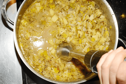Pour in the broth, add potatoes, marjoram, and bay leaf. Bring to a boil. Cook for thirty minutes until the potatoes are soft, then blend until smooth.