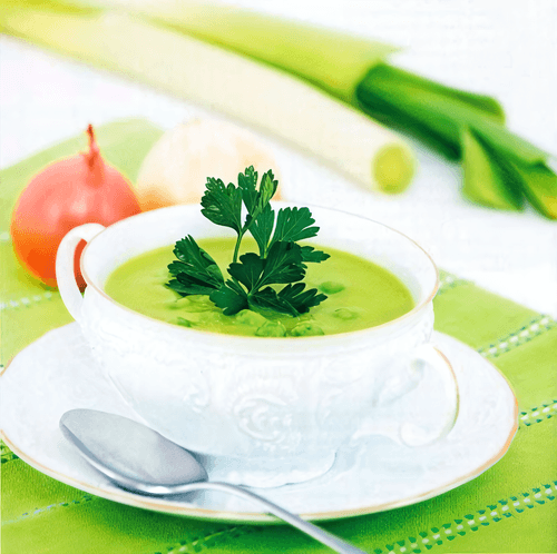 The 'Saint-Germain' purée soup is an exquisite dish of European cuisine named after an aristocratic district in Paris. This delicate, velvety soup delights with a harmonious blend of sweet green peas, savory bacon, and the soft aroma of leeks. Legend has it that it originated in French palace kitchens, captivating discerning gourmets with its refinement. Its lightness makes it a wonderful option for an elegant lunch or dinner. Made with meat broth, it gains a rich flavor, while fresh parsley leaves add an elegant finishing touch. This soup not only pleases the palate but also warms the soul – a perfect choice for those who appreciate classic culinary traditions and gastronomic sophistication.