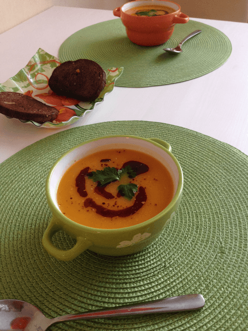 Pour into plates, garnish with drops of pumpkin oil and ground chili.