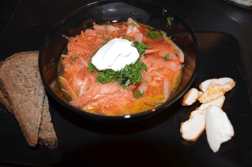 In 10 minutes, the borscht will be ready. Let it steep for another 30 minutes, then pour it into deep plates, serve with sour cream, black bread, grated garlic, and lard! (The last 3 ingredients are to taste, but I consider black bread essential).