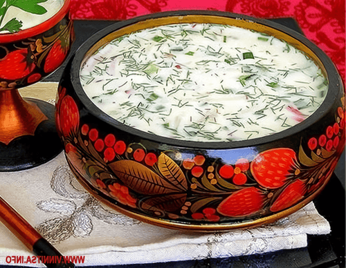 Okroshka on mineral water is a refreshing and light dish of Russian cuisine, popular in warm weather. This cold soup, which originated in the 17th century, is traditionally made with kvass, but using carbonated mineral water makes its taste even lighter and more unusual. The dish includes tender pieces of boiled sausage, potatoes, eggs, crunchy cucumbers and radishes, aromatic herbs, while the dressing of sour cream, kefir and mayonnaise adds richness and a creamy texture to the okroshka. A light acidity from citric acid harmoniously completes the flavor palette. Okroshka not only quenches thirst but also serves as an ideal option for a light and nutritious lunch on a hot day. It is served chilled with fresh herbs for maximum enjoyment of freshness.