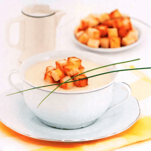 The 'Dubarry' soup is an exquisite representative of European cuisine, named after the famous Madame Dubarry, the favorite of King Louis XV. The main ingredient of this refined dish is tender cauliflower, giving the soup a velvety texture and subtle creamy flavor. The light aroma of roasted flour and butter is complemented by soft notes of milk and spices, creating a harmonious blend. The final touch is an airy mixture of sour cream and egg yolks, making the soup even richer and more delicate. It is served hot, sprinkled with crispy croutons that add an interesting contrast in textures. Ideal as a light first course for a festive lunch or cozy family dinner.