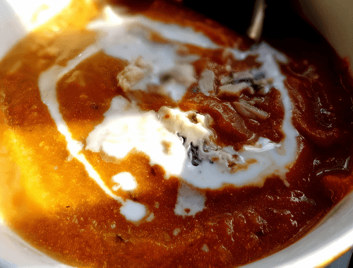 When the vegetables are ready, peel them and crush the garlic. They peel very easily. While hot, blend them and add to the soup pot, add a tablespoon of curry paste, and carefully stir in the milk, bringing the soup to the desired consistency. Salt, pepper, fresh thyme.