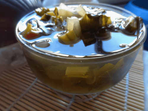 You can cook soup in meat broth, but I made it vegetarian. Chop a large onion and 3 celery stalks finely and boil in a 2-liter pot until softened.