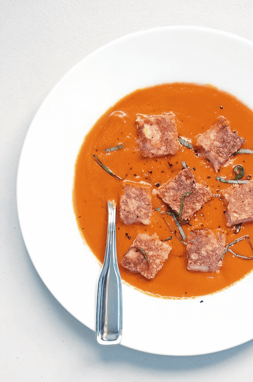 Spicy tomato soup with cheese croutons is a true European classic that combines the rich flavor of tomatoes with the spicy heat of red pepper and the aroma of basil. The roots of this dish trace back to Italian and French cuisines, where pairing tomato soup with crispy bread slices has long been a tradition. Its sharpness is gently softened by the creaminess of melted cheese in golden croutons, creating a perfect balance of flavors. The croutons absorb the aroma of the soup while maintaining their appetizing texture. This dish is suitable for both a cozy family dinner and a festive lunch, offering warmth and richness in every sip.