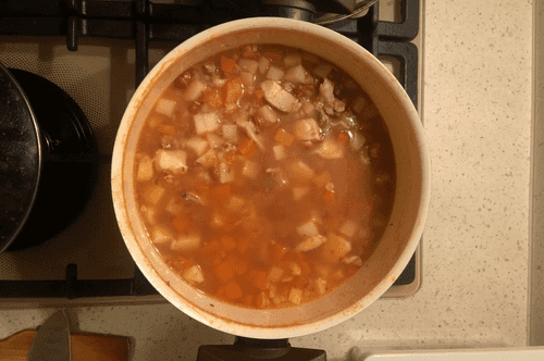 When the chicken is cooked, add buckwheat and carrots, cook for about 10 minutes until semi-cooked, then add potatoes and a can of beans in tomato sauce. Cook for 15-20 minutes until the potatoes are ready.