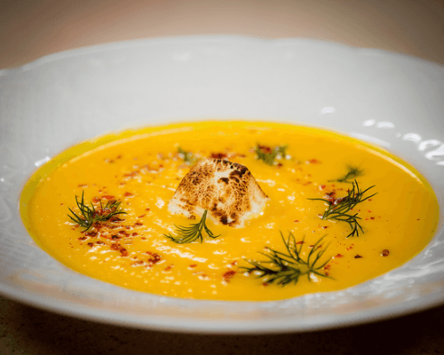 Carrot-ginger soup with marshmallows is an original combination of the bright taste of carrots, spicy ginger, and airy sweetness of marshmallow. It was born as a bold experiment of European cuisine, merging traditional vegetable soups with dessert notes. The velvety texture of the puree, enhanced by coconut milk and honey, gives the dish richness and tenderness, while lemon juice adds a light tanginess. Flecks of spicy cardamom enhance the aroma, creating a warm, cozy flavor. A special detail is the marshmallow that melts on the surface of the hot soup, adding softness and playful sweetness. This soup is perfect for autumn evenings, warming the soul and surprising with its unusual flavor combination.