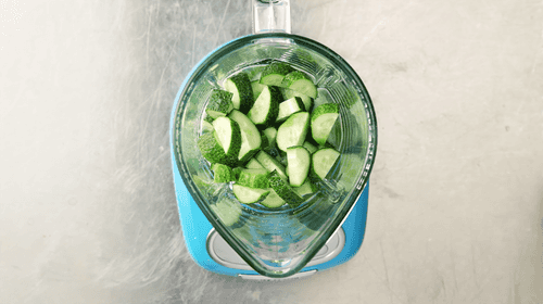 Blend cucumbers, wine vinegar, syrup, sugar, and salt on high speed for two minutes.