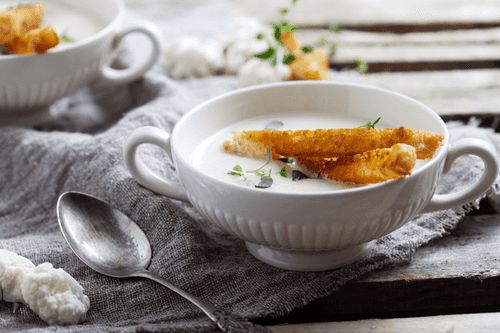 Cold cauliflower puree soup is an elegant and delicate dish of French cuisine. Its roots trace back to the tradition of light summer soups created for exquisite gastronomic pleasure. Cauliflower gives the soup a silky texture, while Granny Smith apple adds a subtle tartness that enhances the flavor. Spicy notes of curry and cardamom create a warm aroma, harmonizing with the creamy base of milk and yogurt. It’s the perfect choice for a hot day—the chilled soup refreshes and delights with its balanced taste. Garnished with almonds and edible flowers, it becomes a true work of art on the plate. It is ideal as a light dish before the main dinner or as an exquisite summer lunch.