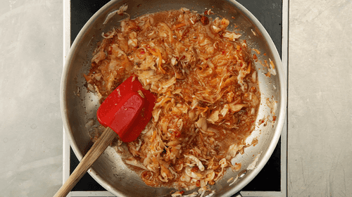 Transfer the sauté to the broth with cabbage and cook for another 10 minutes, then add the stewed sauerkraut. Bring to a boil, season with baked beans, sugar, salt, black pepper, and apple cider vinegar, and remove from heat.