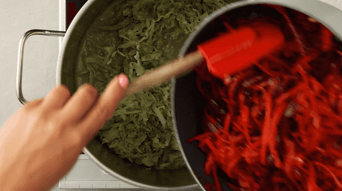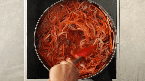 Sauté onion, carrot, and parsley root in vegetable oil with tomato paste and remaining broth for 15 minutes, then add beetroot and mix.