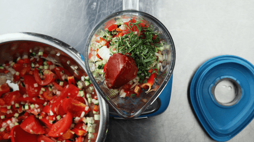 Blend the remaining vegetables with garlic, tomato paste, olive oil, and finely chopped herbs. There's no need to aim for a uniform consistency; let it retain some texture.