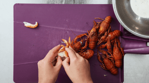 Boil 2 kg of crayfish in boiling, slightly salted water. Clean the crayfish, set the shells aside in a separate bowl, and temporarily place the crayfish necks in the refrigerator.
