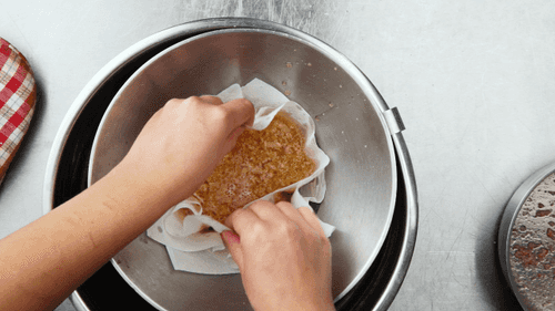 After 90 minutes, take the oil out of the oven and strain it through a fine sieve. For better results, the sieve can be lined with paper towels. Pour the oil into a container or suitable bowl and let it cool. For long-term storage, separate the solidified oil from the jelly-like mass at the bottom of the container to prevent it from going rancid.