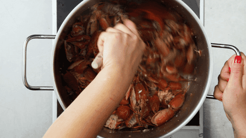 Add vermouth and mix well. Let it simmer for 1 minute, then pour in water to completely cover the shells. Add a bay leaf to the pot and bring to a slow boil.