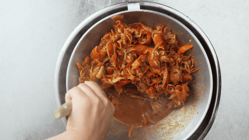 Blend 200 g of shells and 1 tablespoon of brandy as finely as possible to maximize flavor. Melt butter over low heat, add the shell puree. Cover and place in a preheated oven at 80°C, stirring occasionally.