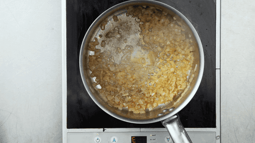 Heat 2 tablespoons of crab oil in a deep pot. Sauté 100 g of finely chopped onion until translucent, but do not let it color. Pour in 2 tablespoons of brandy and let it evaporate for a minute.