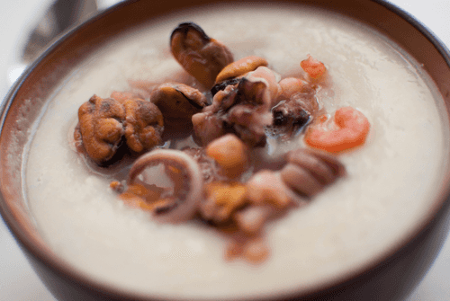 Meanwhile, we sauté the seafood (frozen seafood mix) in milk in a pan, add salt and spices to taste, then drain all the liquid and add our seafood to the soup to taste!