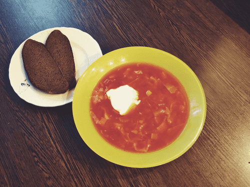 Chop the cabbage, thinly slice the carrot and celery, dice the onion and tomatoes, and cut the beetroot into strips. Canned tomatoes can be replaced with fresh peeled tomatoes with the addition of tomato paste.