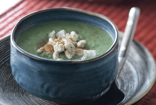 Pour the soup into bowls, add crumbled feta, and sprinkle with nutmeg.