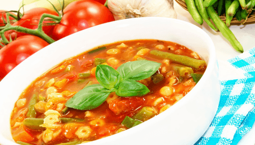 Boil the potato and cut it into cubes. Slice the carrot and celery into rounds, zucchini into slices, and green beans into small pieces. Add the chopped vegetables to the soup, add tomato paste and chopped canned tomatoes. Bring to a boil and reduce the heat. Simmer for 10 minutes or until the vegetables are tender.