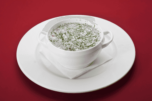 Okroshka on chicken broth with mayonnaise is a refreshing summer dish of Russian cuisine, rooted in ancient traditions of consuming cold soups. The variation with chicken broth gives it a special tenderness, while mayonnaise enriches the flavor with a soft creamy texture. Okroshka combines the freshness of cucumbers, the nourishment of potatoes and chicken fillet, while mustard and lemon juice add a light spiciness. The brunoise cutting creates harmony of textures, and prolonged chilling enhances the taste. It is an ideal option for a hot day, allowing one to feel full without heaviness while offering a rich flavor bouquet. The dish is served chilled, often with herbs and bread, and pairs excellently with kvass or light beverages.