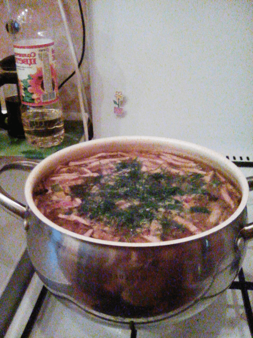 Cut the boiled sausage and servelat into thin strips (or cubes, as you like) and fry until lightly crispy. Drain excess fat and add to the broth. Also, add the boiled chicken fillet.