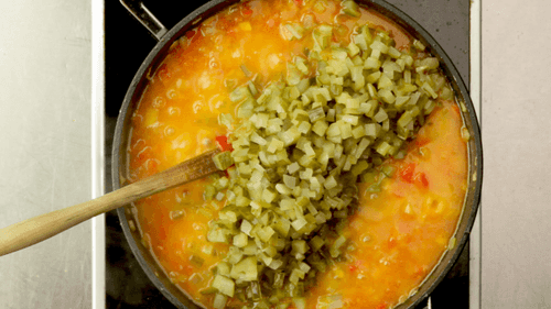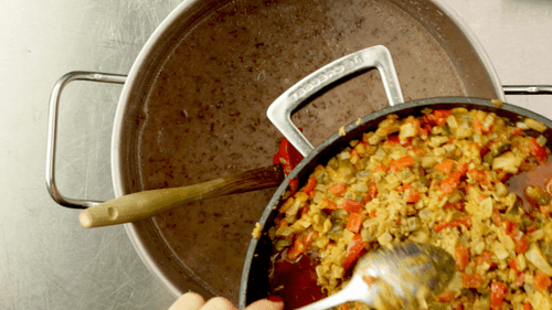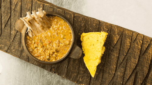 Remove the meat and the spice bag from the broth (it should be discarded). Mix the bean puree into the broth until smooth, then add the sautéed vegetables. Serve with flatbread.