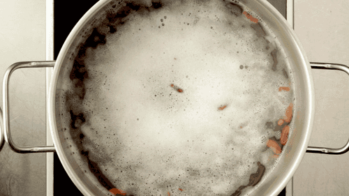 Roast the parsnip on a flame or dry pan to release its aroma. Gather spices in a cheesecloth bag for the broth: parsnip, allspice, hot pepper, and clove. Pour three liters of water over the lamb, bring to a boil, let it simmer a bit, and then drain. Next, cook in new water with the spices. The broth should reduce by half.