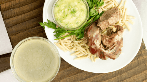 Zhigig-galnash is a traditional Chechen dish symbolizing home comfort and hospitality. Its history dates back centuries when warriors and hunters returned to the hearth expecting a hearty and simple meal. A rich broth made from fatty beef infused with the aroma of parsnip, fragrant pepper, and cloves creates a strong base. Tender dumplings that are thin and elastic absorb the broth's flavor, while the spicy berblan sauce on garlic mashed potatoes complements the dish's harmony. It is food that warms the soul, unites families, and prompts reflection on roots and traditions. Served separately—broth, dumplings, and sauce—so everyone can enjoy the richness of flavors at their own pace.