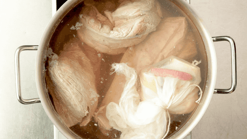 Roast the parsnip root on a flame or dry pan for a rich aroma. Gather a bouquet garni of parsnip, allspice, cloves, and hot pepper. Add it to the beef, pour in water, and cook the broth. The broth should reduce by half.
