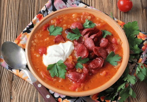 Thick tomato soup with smoked sausages is a rich dish with a vibrant flavor that perfectly warms on cool evenings. Its roots trace back to Mexican cuisine, where tomatoes, spicy seasonings, and smoked meats create a unique flavor palette. The velvety texture of the soup is achieved through mashed potatoes and butter, while the smoked sausages add richness and a hint of spiciness. A light sweetness from sugar balances the acidity of the tomatoes, and aromatic herbs and black pepper deepen the taste. Heat is adjusted by adding Tabasco or chili, making the soup versatile. It is served with a dollop of sour cream and fresh herbs that soften the rich flavor and add freshness. This soup is an ideal choice for those who appreciate rich and aromatic dishes with a Mexican character.