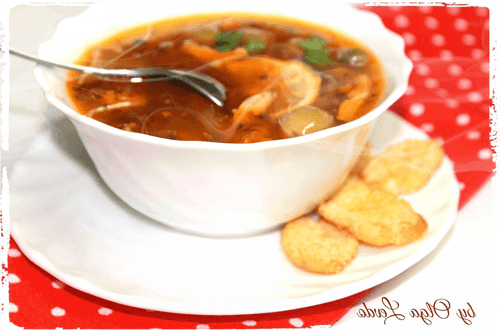 Solanka on chicken broth is a fragrant dish of Russian cuisine filled with a wealth of flavors. The origins of solanka date back centuries when chefs experimented with leftover meat products to create a thick, rich soup. It combines the spiciness of pickles and capers, the tenderness of smoked chicken, sausages, and salami, as well as the sweet-sour depth of tomato paste. The harmony of ingredients makes it perfect for warming lunches or family gatherings. Serving with lemon and sour cream enhances the contrast of flavors, turning each sip into pleasure. Solanka is not just a soup but a rich and hearty culinary masterpiece that can surprise even the most discerning gourmet.