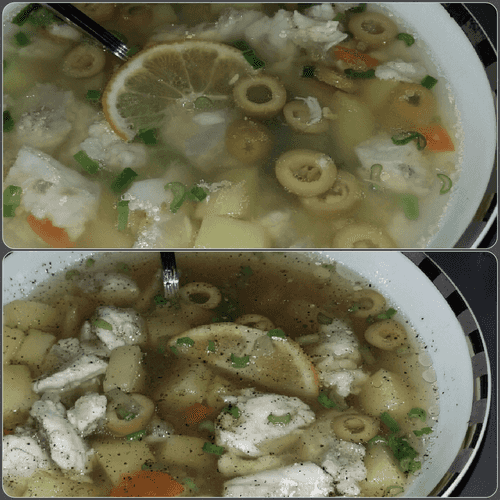 Add finely chopped green onions, sliced olives, and lemon to the fish soup.