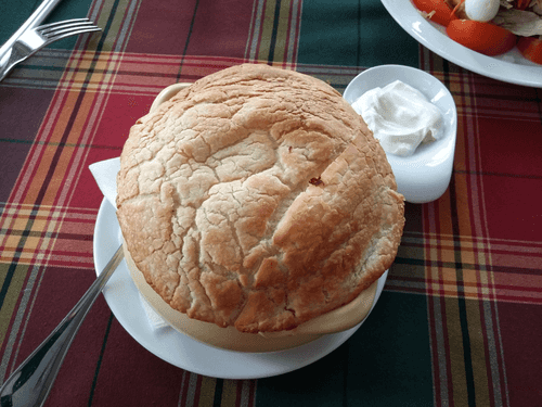 The cabbage soup takes a long time to prepare: all the ingredients first languish in a cast-iron pot, then are left to infuse for another day, and then baked under a puff pastry lid so that the soup acquires its final taste and appearance. The dense aroma comes from the combination of meat broth, caraway, bacon with garlic and fresh dill, which are added at the very end. You open this time capsule, throw back the dough lid - and there is such a thick cabbage soup smell that it takes the breath away even the eaters.