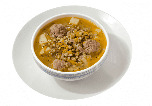 A delicate, homemade and quick soup with pork meatballs and mung beans. They are accompanied by potatoes, onions, carrots and thyme with garlic. And no Asian nuances.