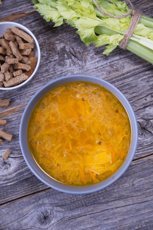 Homemade chicken soup with vermicelli and celery is a cozy and warming dish that has been part of European culinary tradition for centuries. Its soft, rich broth flavor with tender pieces of chicken and light vermicelli texture makes it an ideal choice for a comforting lunch. The slight sweetness of carrots and the spiciness of celery enhance the taste, while bay leaf and black pepper add a hint of spice. This soup not only delights the palate but also serves as an excellent option for boosting immunity due to its healthy ingredients. It is served hot with aromatic herbs and is especially good in cold weather when warmth and comfort are desired.